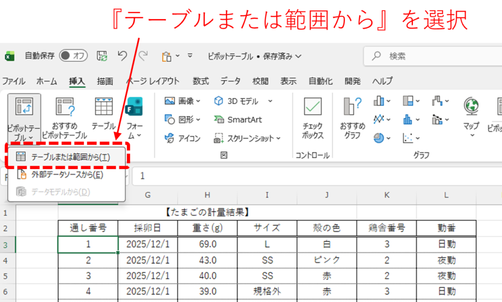 1.『挿入』 タブにある『ピボットテーブル』のプルダウンメニュー をクリックします。