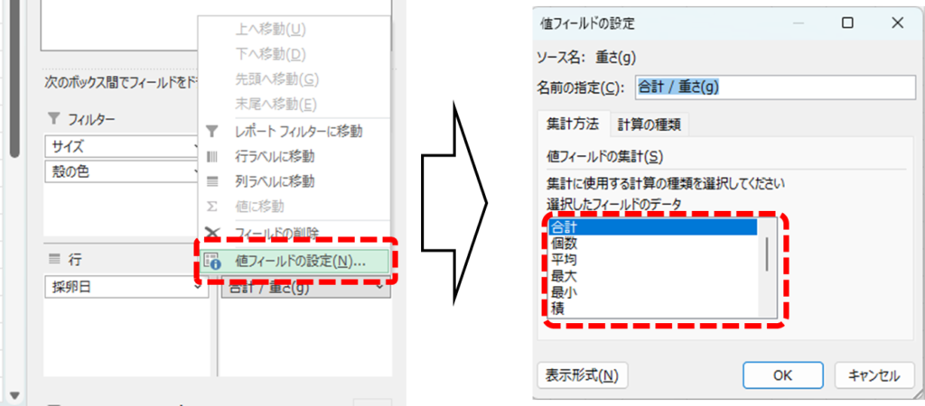 『値』ボックスにおける表示は、デフォルトでは『合計』または『個数』ですが、プルダウンメニューから 『値フィールドの設定』を選ぶと、平均・最大・最小・件数などに切り替え可能です。