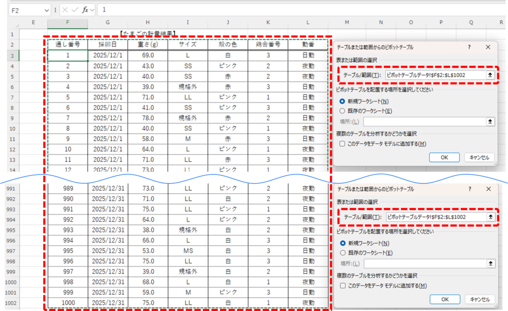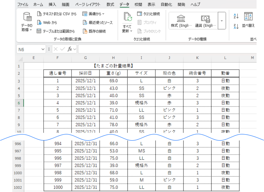 以下には、卵を例として関連するデータを紐づけた一覧表を用意しました(データ点数は1,000件)。
