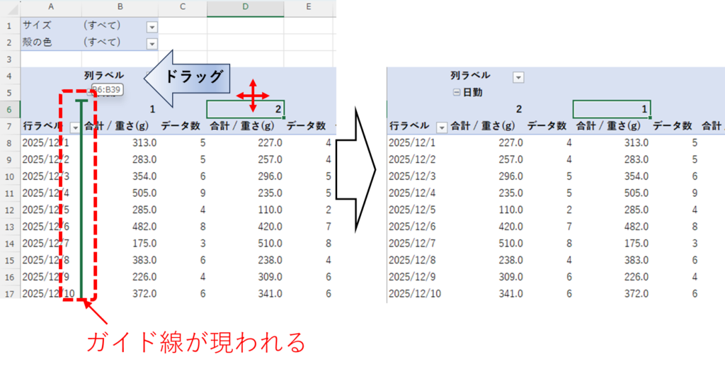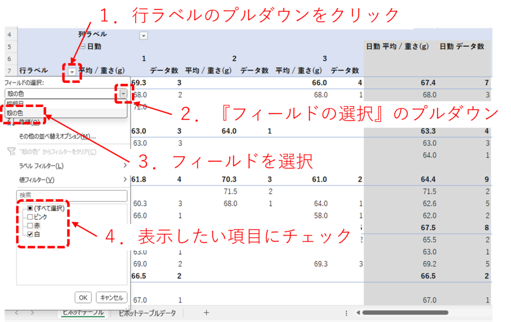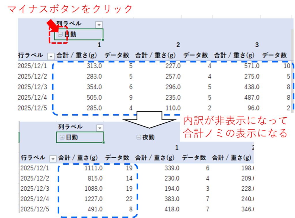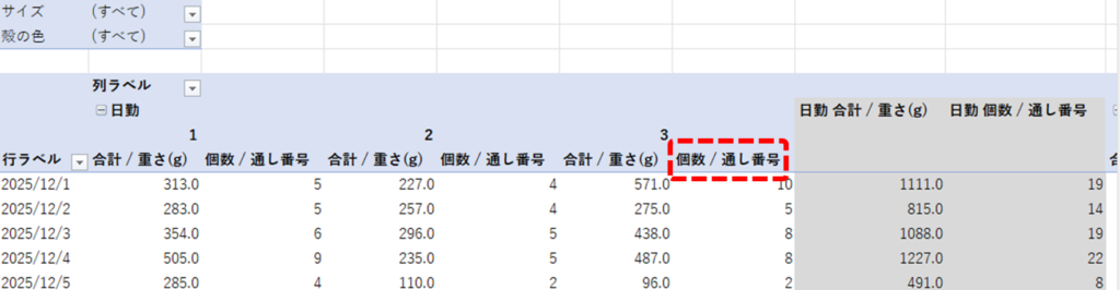 この場合、見て分かるように、『採卵日』の行が太字となっており、採卵日ごとの小計データになっており、『殻の色』はその下の階層の内訳データになっています。