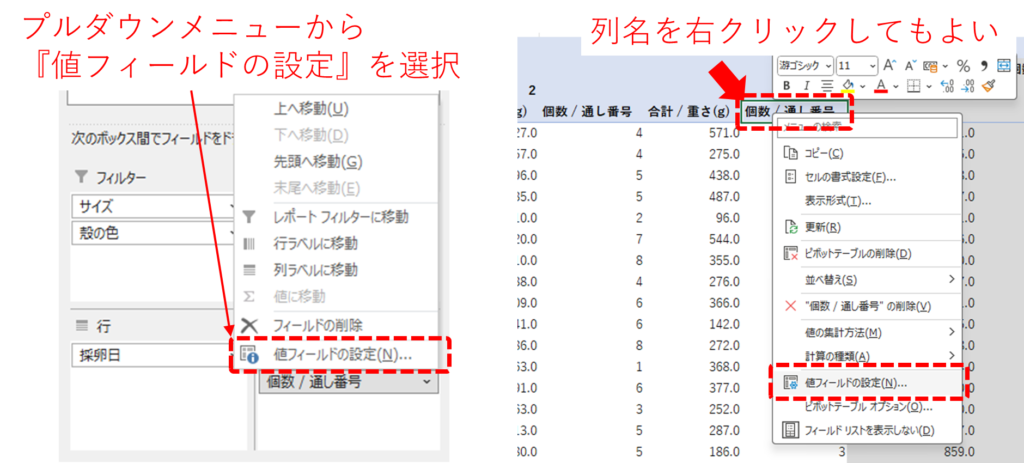 1.『値』ボックスのプルダウンメニューから『値フィールドの設定』を選択します。