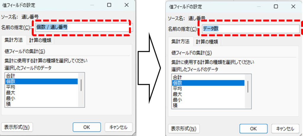 2.『値フィールドの設定』のダイアログボックスが表示されたら、『名前の指定』の欄に目的の列名を入力します。