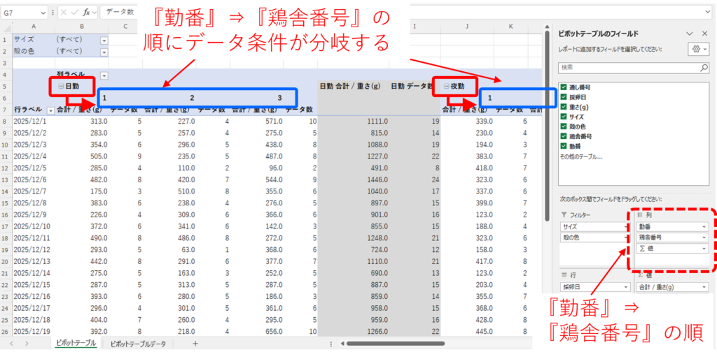 たとえば、今回の例であれば、勤番⇒鶏舎番号の順に配置すると、『日勤』の中の『鶏舎番号1、2、3』と『夜勤』の中の『鶏舎番号1、2、3』でそれぞれデータが集計されます。