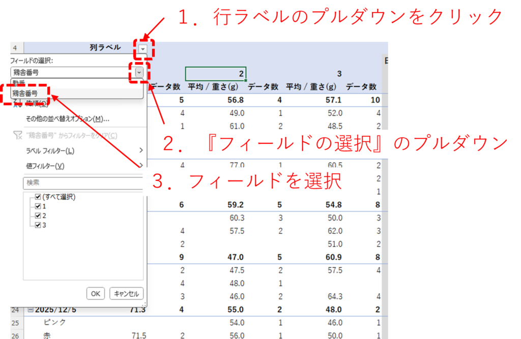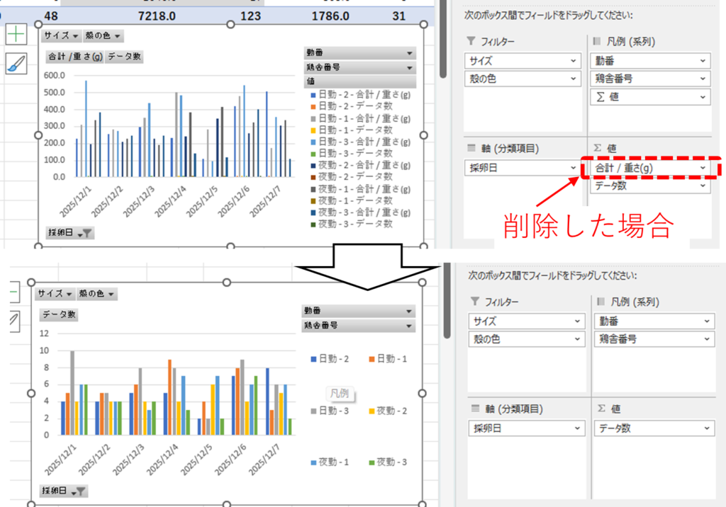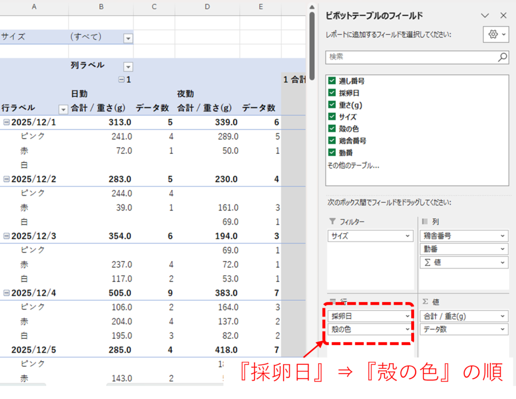 下の例では『採卵日』⇒『殻の色』の順にフィールドを配置しています。