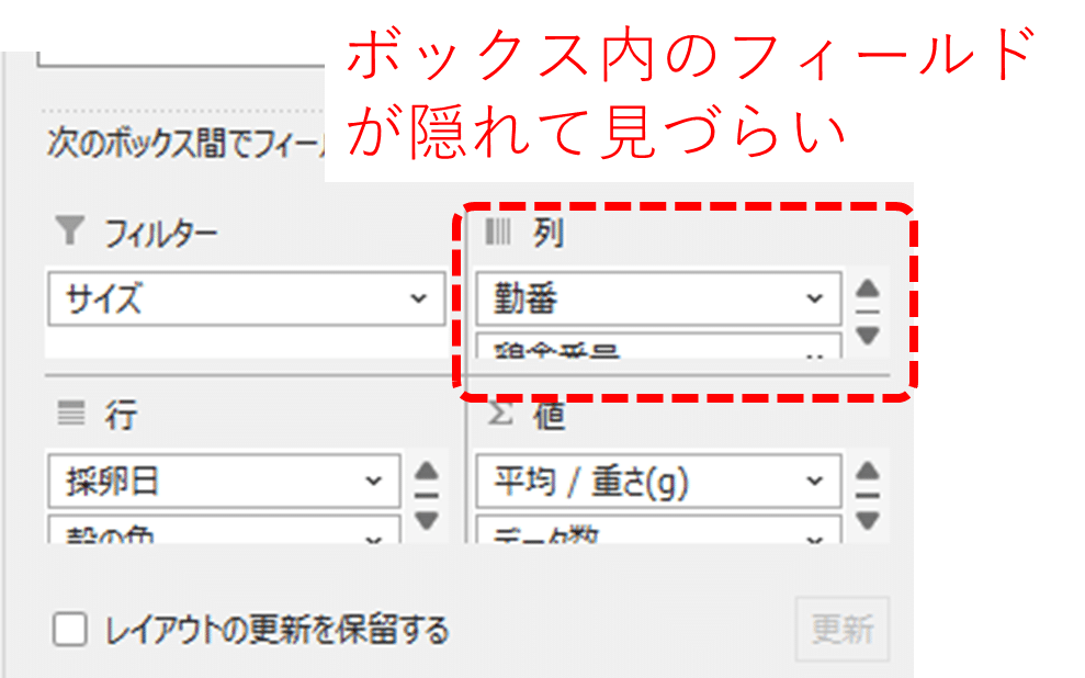 フィールドの数が多いと、ボックス内にフィールドが収まりきらず、選択しづらくなることがあります。
