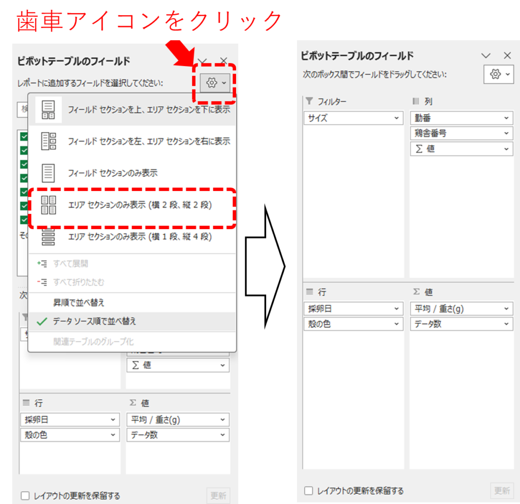 フィールドリストの右上にある歯車アイコンのプルダウンメニューから、好みの配置を選択します。
