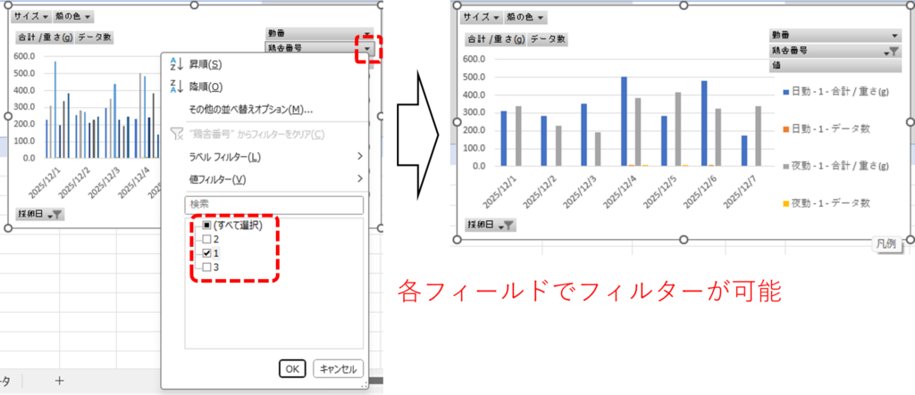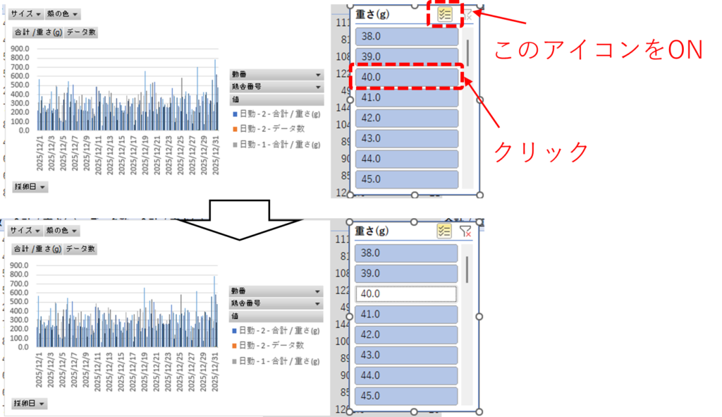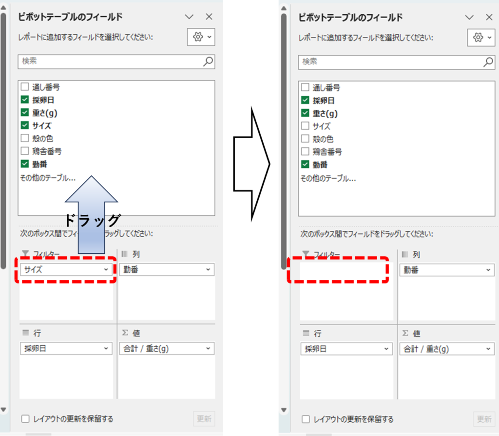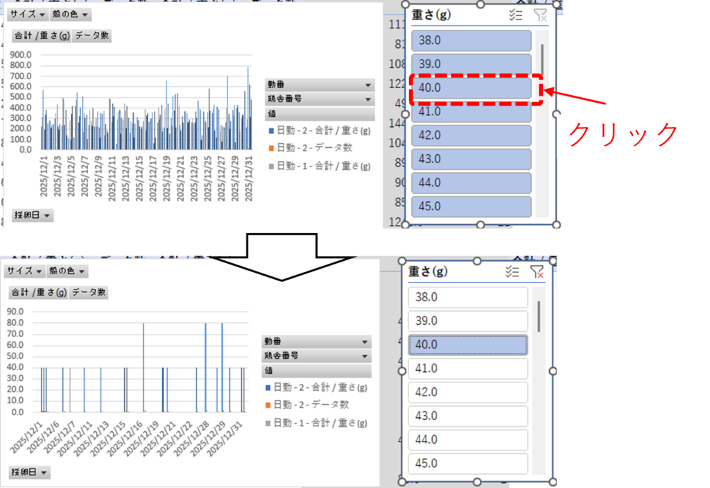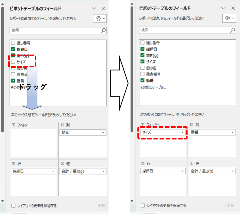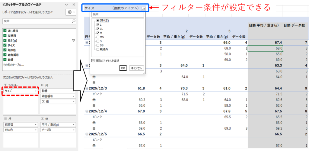 以下の例ではフィルターのボックスに『サイズ(卵の規格)』を設定しました。