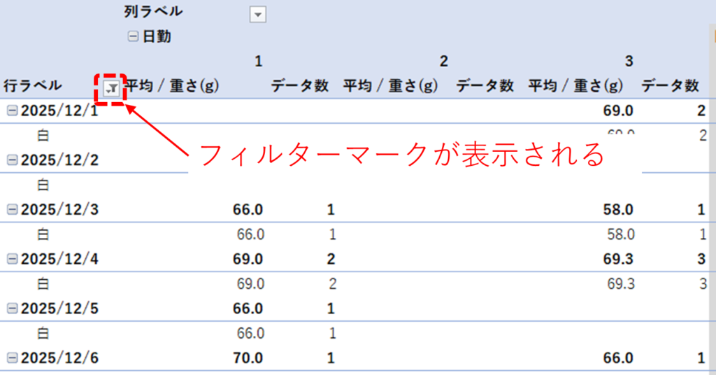 また行ラベルのプルダウンボタンにフィルターマークが表示されるようになるため、フィルターがかかっているかどうか一目でわかります。