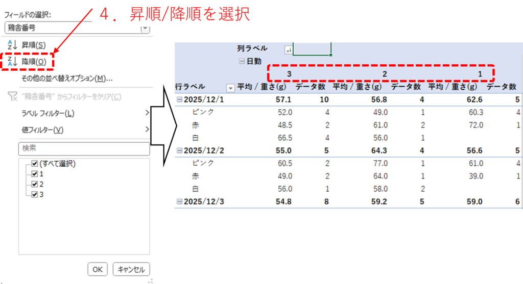 4.昇順/降順を選択します。ここでは降順(3→2→1)に並べ替えます。