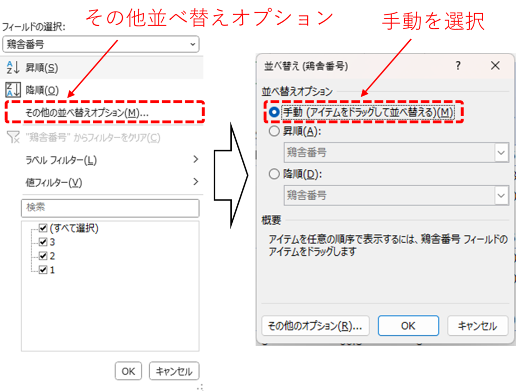 これを解除するには、プルダウンメニューの『その他並べ替えオプション』から『手動』にチェックを入れてOKボタンをクリックします。
