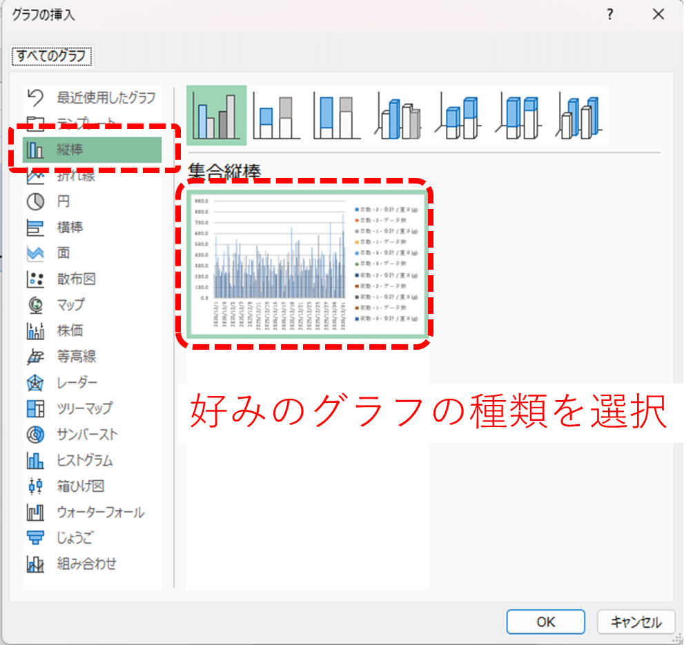 3.『グラフの挿入』のダイアログボックスが表示されたら、好みのグラフの種類を選択します。