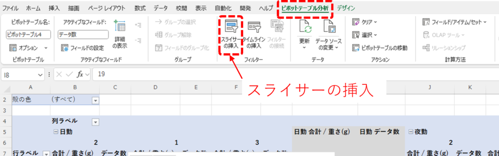 1.ピボットテーブルを選択した状態で、『ピボットテーブル分析』タブの『フィルター』セクションにある『スライサーの挿入』をクリックします。