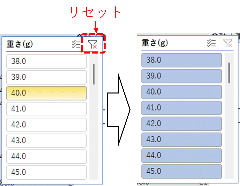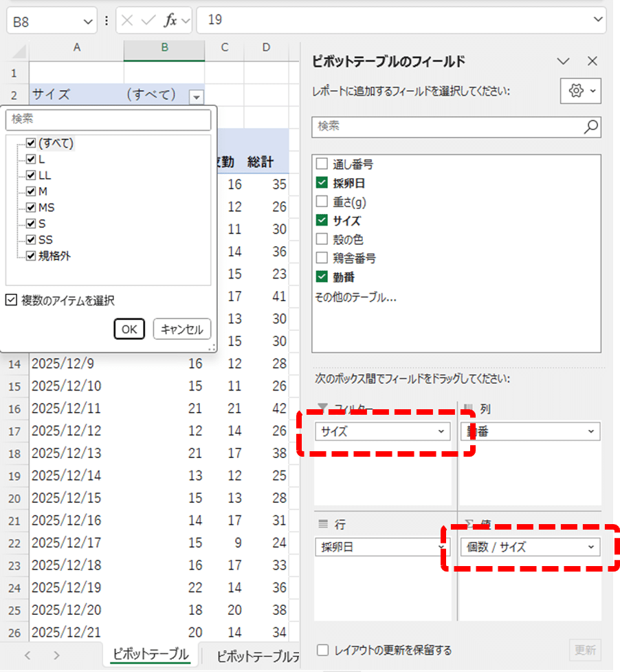 これにより、ピボットテーブルの左上にフィルター条件が表示され、チェックをON/OFFすることで、サイズごとのデータ集計をすることができます。