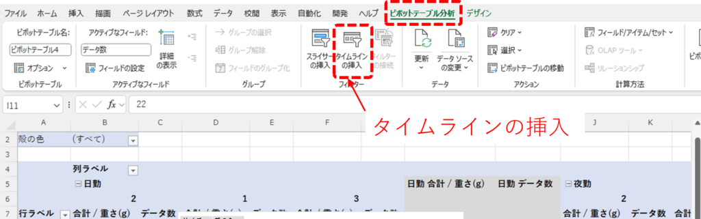1.ピボットテーブルを選択した状態で、『ピボットテーブル分析』タブの『フィルター』セクションにある『タイムラインの挿入』をクリックします。