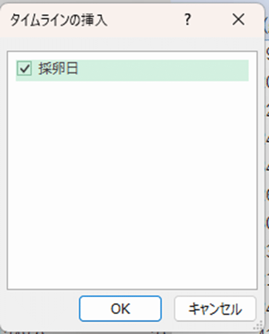 2.『タイムラインの挿入』のダイアログボックスが表示されたら、タイムラインを設けたいフィールドを選択します。