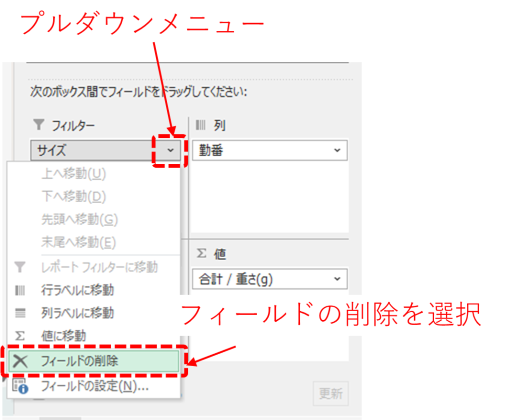 フィールドの削除はボックス外にドラッグすることで簡単に行えます。