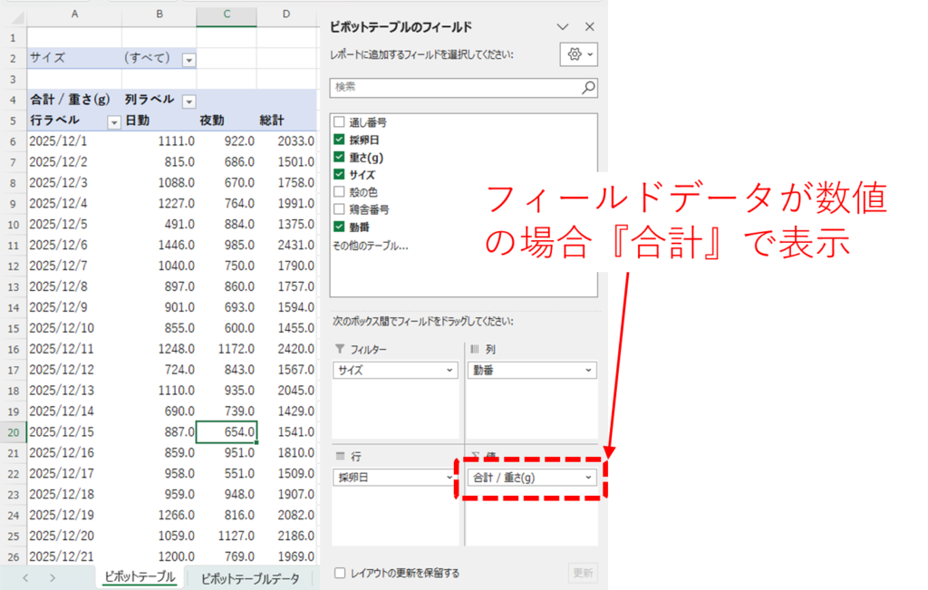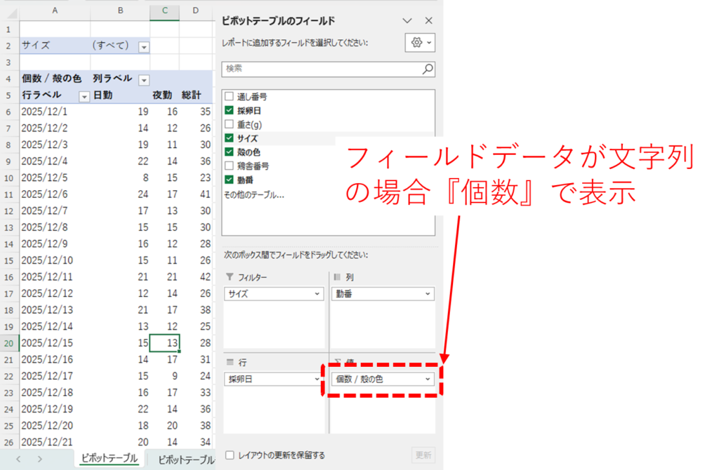 反対にフィールドを入れ替えて、鶏舎番号⇒勤番の順に配置すると、『鶏舎番号1』の中の『日勤、夜勤』、『鶏舎番号2』の中の『日勤、夜勤』、『鶏舎番号3』の中の『日勤、夜勤』でそれぞれデータが集計されます。