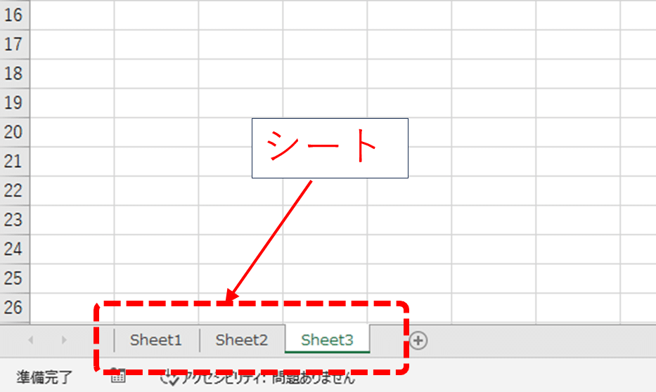 シートとはExcelブック内でページのように分かれている作業スペースです。