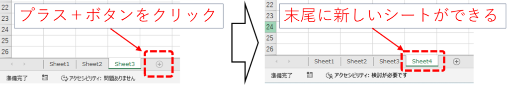 シートタブの右側にある+ボタンを押すと新しいシートが末尾に挿入されます。
