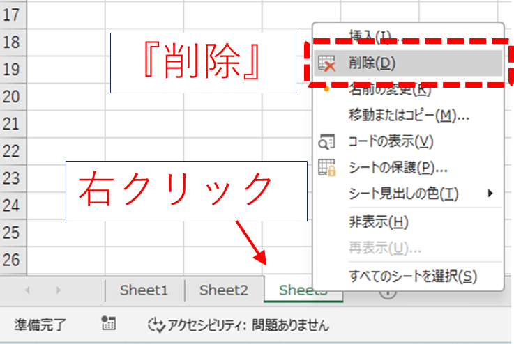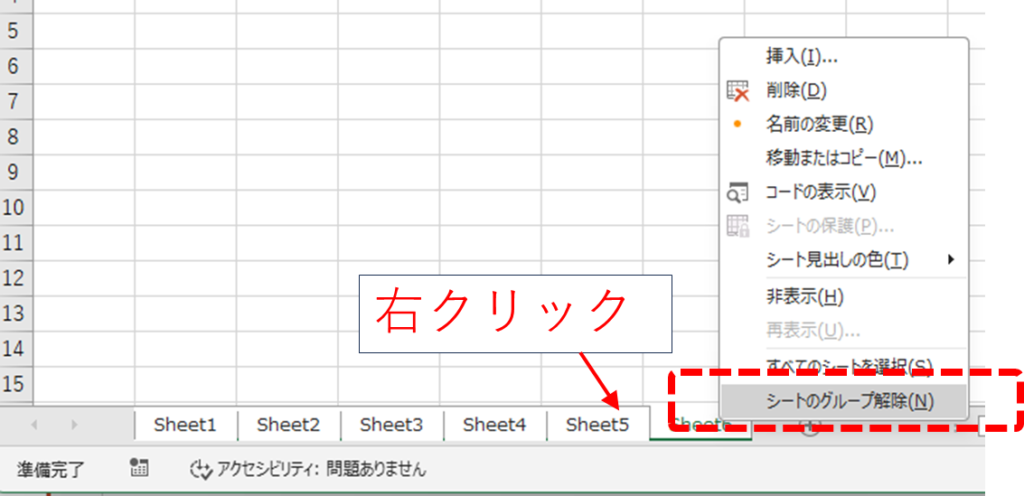 全てのシートを選択している状態では、右クリックメニューが便利です。