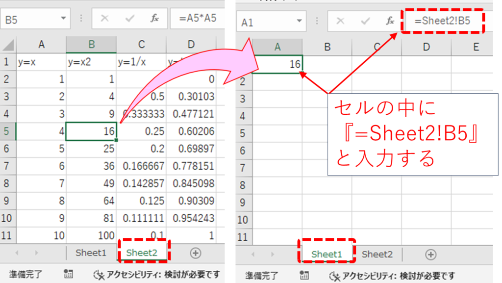 これで Sheet2 の B5 の値が Sheet1 の数式を入れたセルに反映されます。