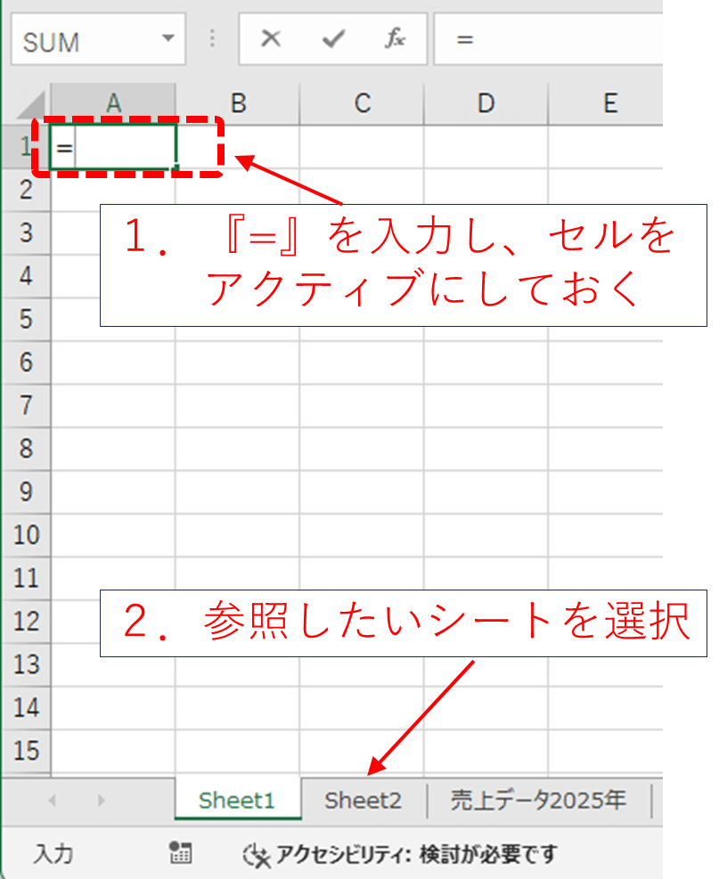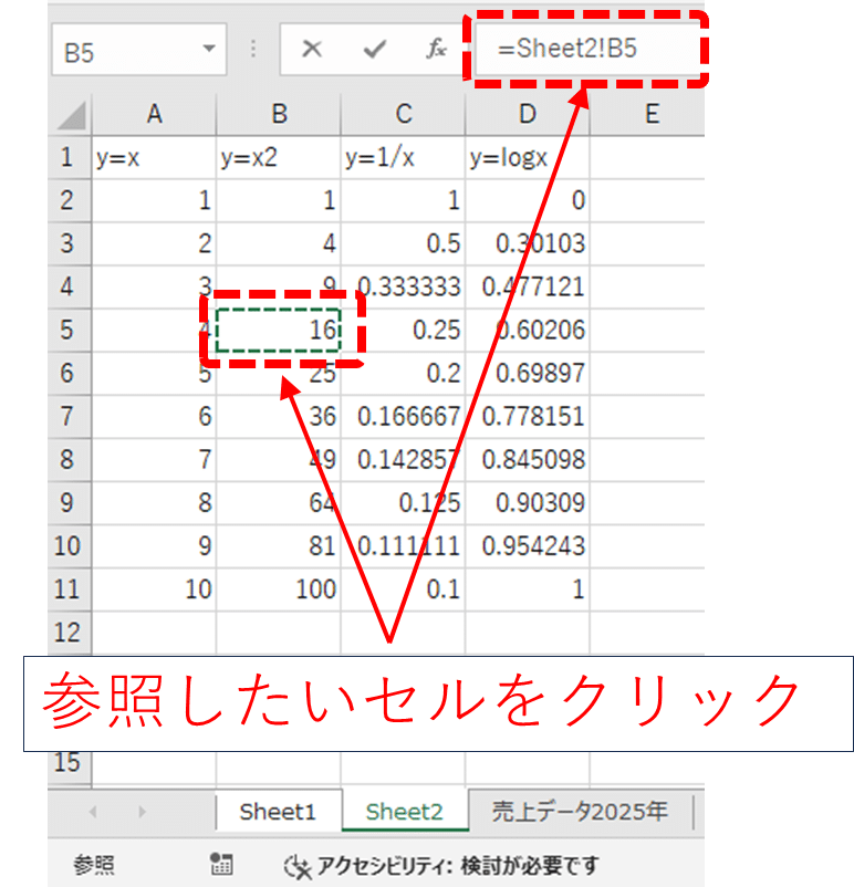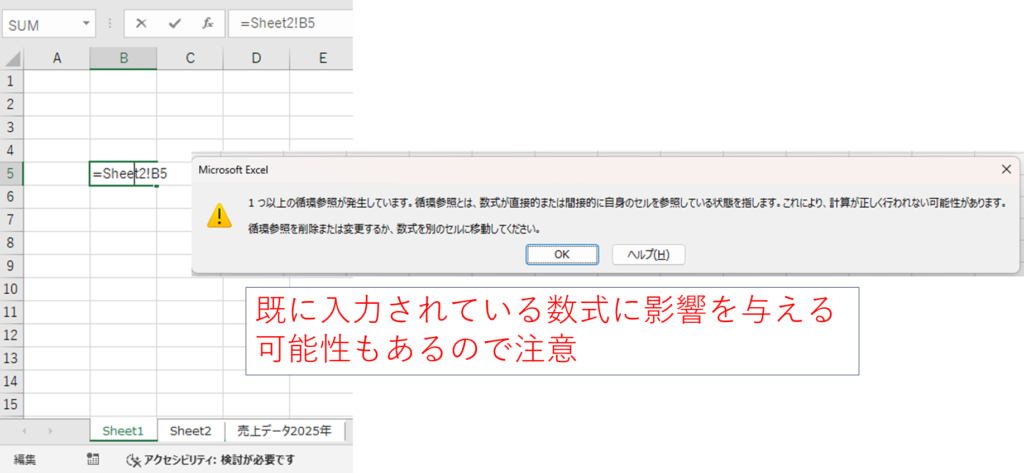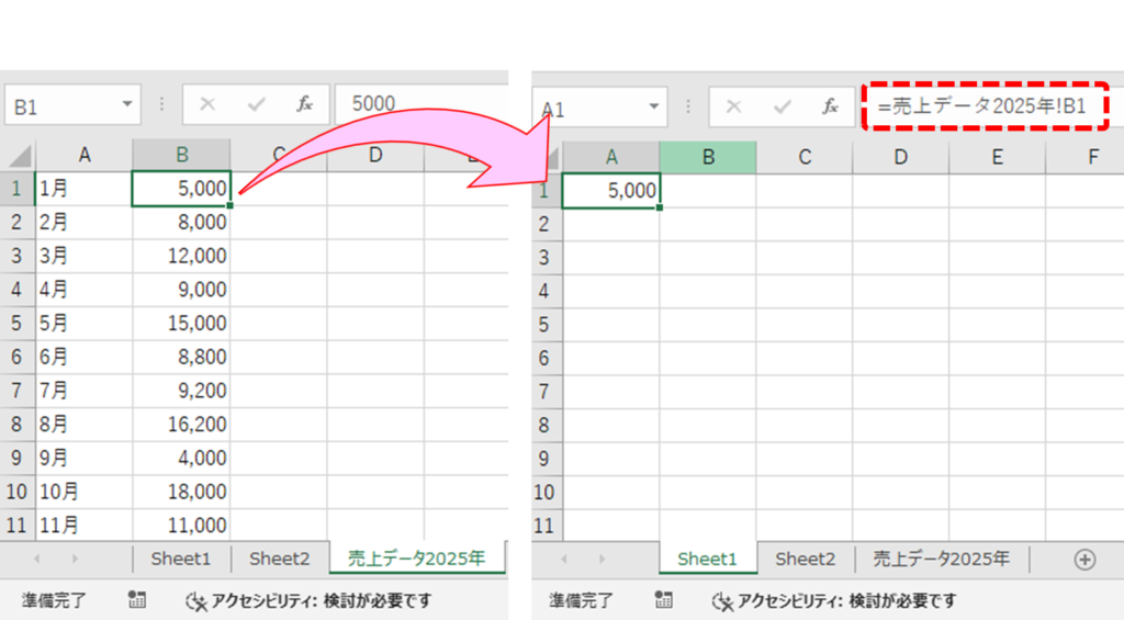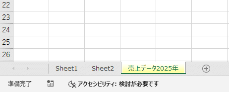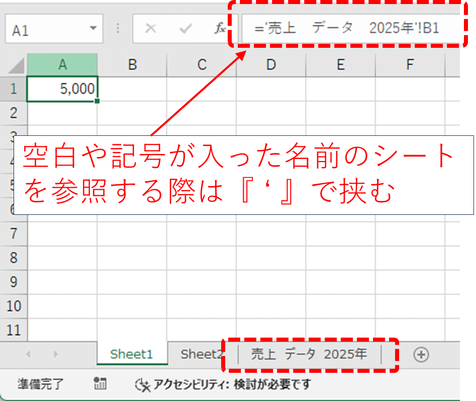 『売上 データ 2025年』という空白を入れたシート名にした場合、数式の参照は『 ‘売上 データ 2025年’ 』と『 ‘ 』で挟む必要があります。
