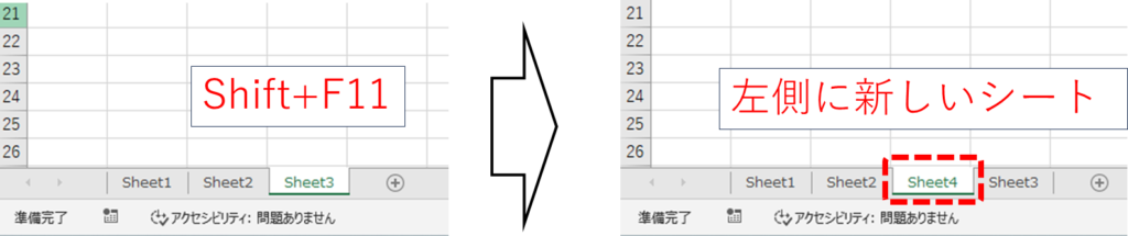 選択中のシートタブの左側に新しいワークシートが即座に挿入されます。