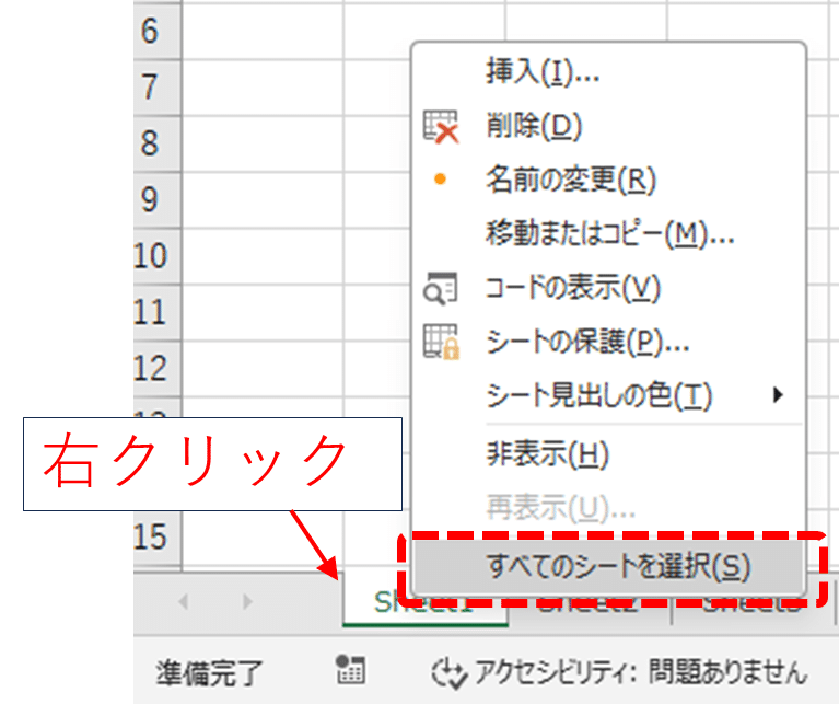 全てのシートを一度に選択する場合は、右クリックメニューが便利です。