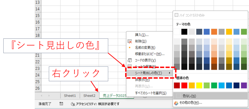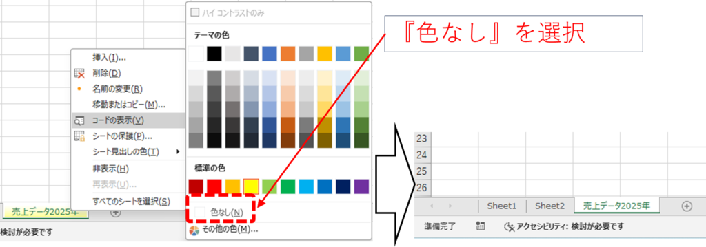 シートの色を解除または変更したい場合は、右クリックメニューの『シート見出しの色』から『色なし』を選択します。