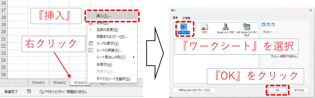 2.『挿入』のダイアログが表示されたら、『標準』タブから『ワークシート』をクリックして『OK』ボタンを押します。
