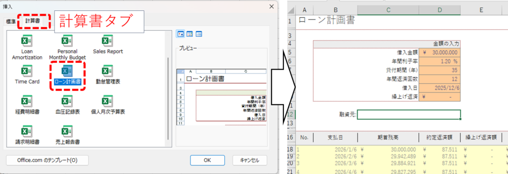 『挿入』のダイアログボックスで、『計算書』タブをクリックすると、様々なシーンに合わせたExcelシートを利用できます。