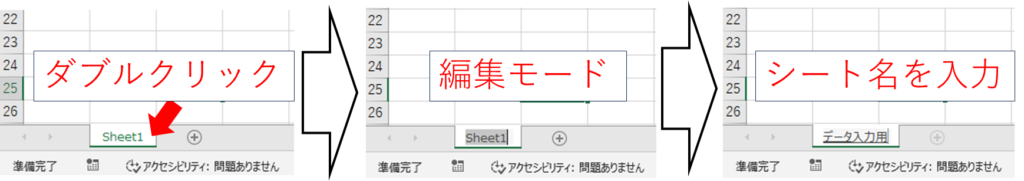 シートタブを ダブルクリック → 編集モードに入ったら、好きな名前を入力
