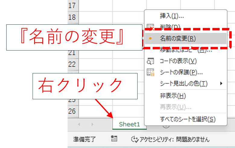 シートタブを右クリック → 『名前の変更』をクリック → 編集モードに入ったら、好きな名前を入力