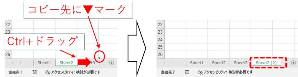 1.コピーしたいシートタブをクリックし、そのまま横方向にドラッグします。