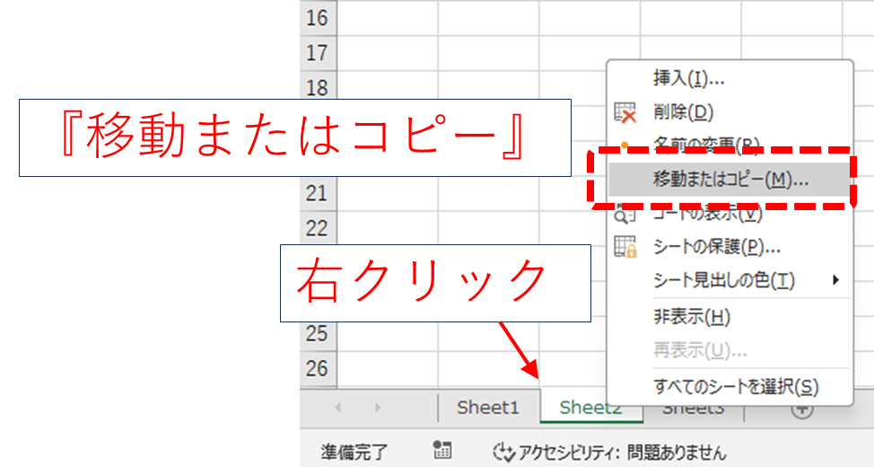 シートタブが多くなると、ドラッグ&ドロップでは見づらくなることがあるため、右クリックメニューもおすすめです。