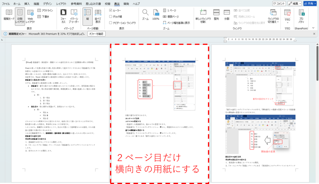 今回は下図の2ページ目だけ横向き用紙にします。