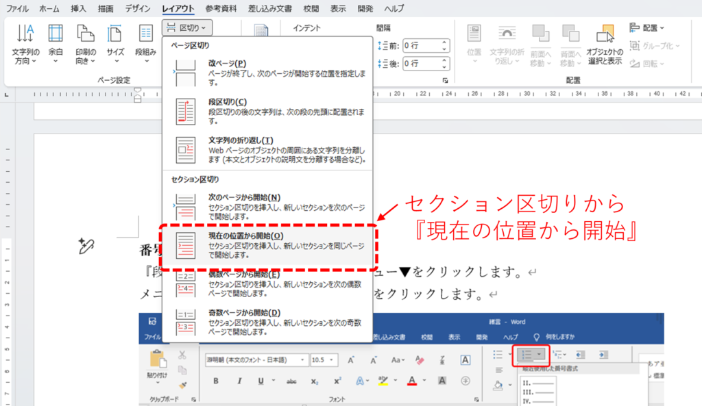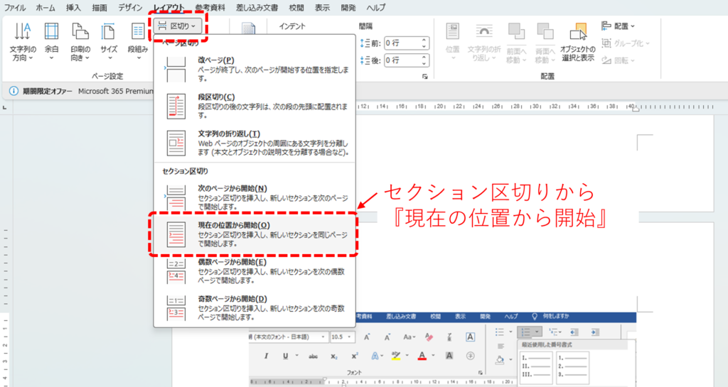3.『区切り』のアイコンをクリックし、表示されたプルダウンメニューから『セクション区切り』の中にある『現在の位置から開始』を選択します。