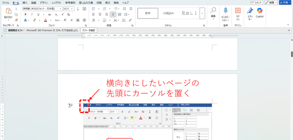 1.横向きに切り替えたい段落(ここでは2ページ目)の先頭にカーソルを置きます。