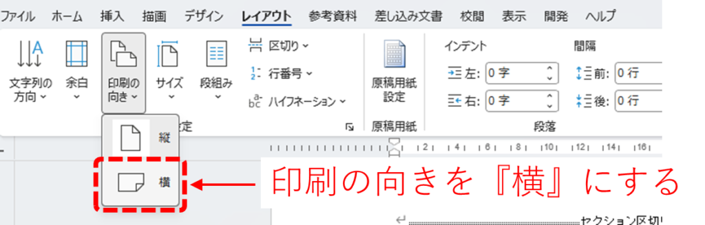 次に、区切ったセクションの用紙方向を変更します。