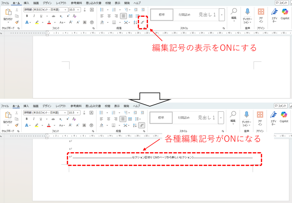 『ホーム』タブの『編集記号の表示/非表示』をオンにすると、セクション区切りの位置を確認しやすくなります。