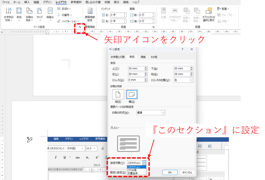 『ページ設定』のダイアログボックスが表示されたら、『余白』のタブの一番下にある『設定対象』が、『このセクション』になっていることを確認しましょう。