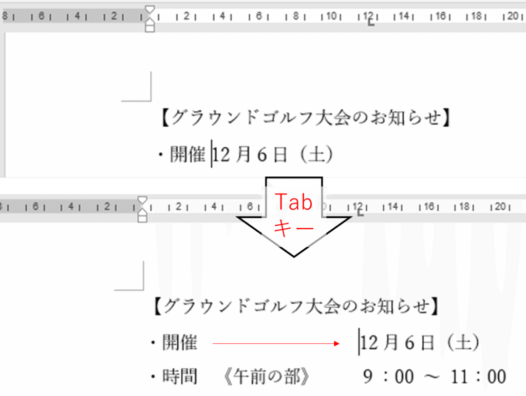 Wordにおけるタブ機能 とは、文書内の文字の位置を指定してそろえるための機能です。