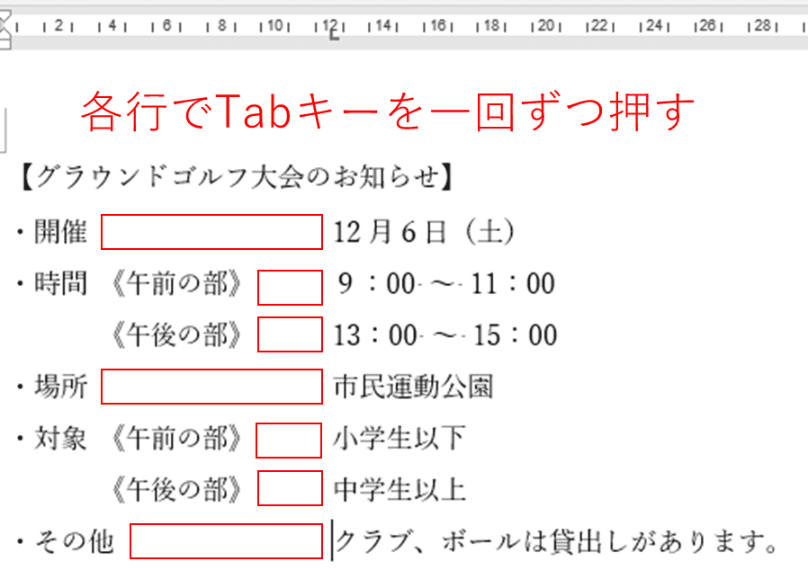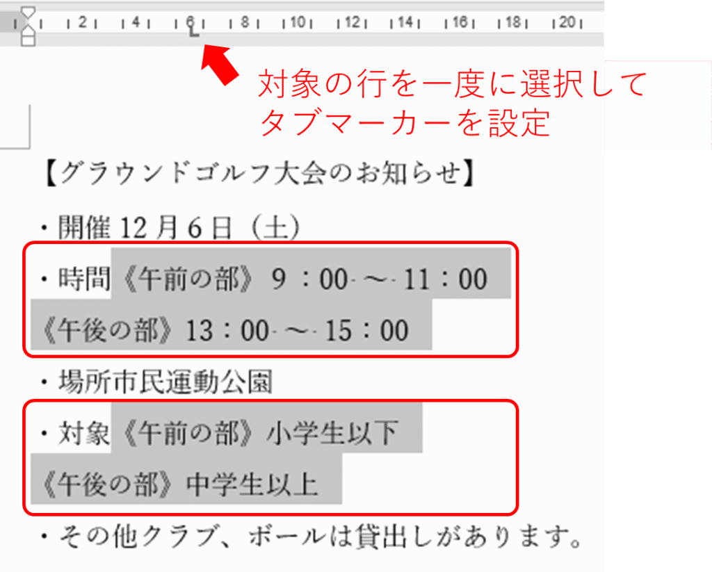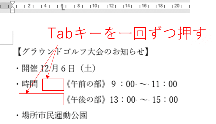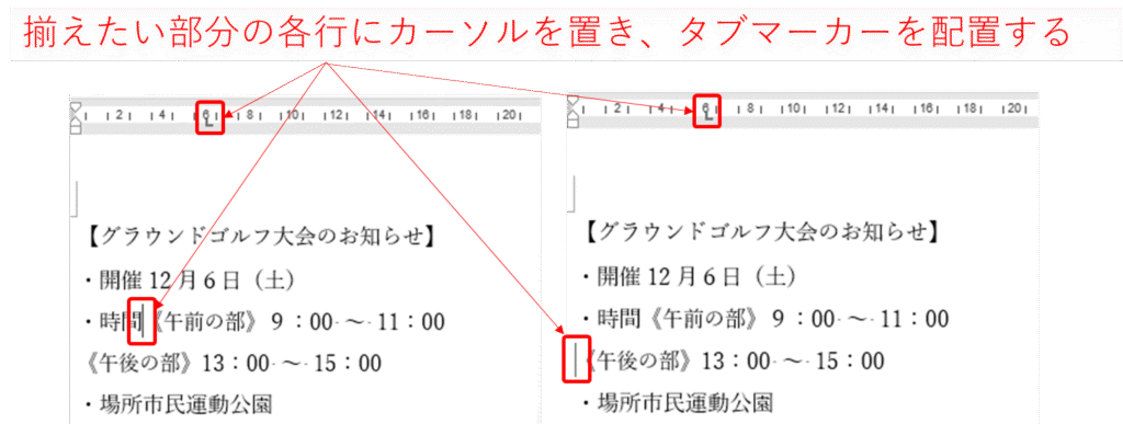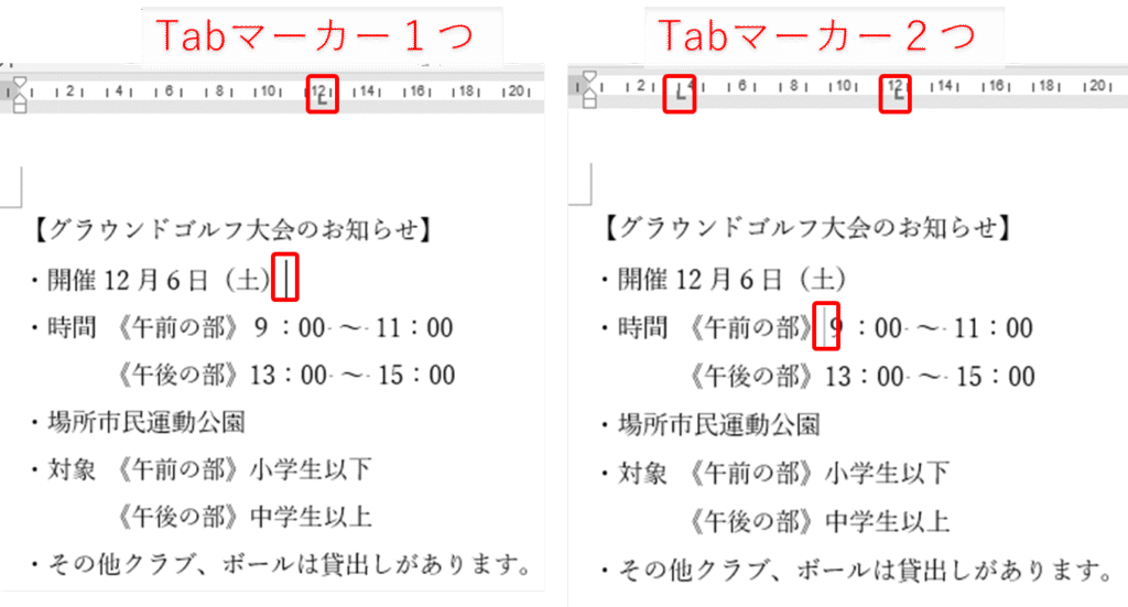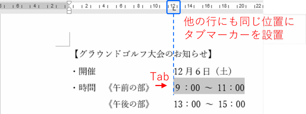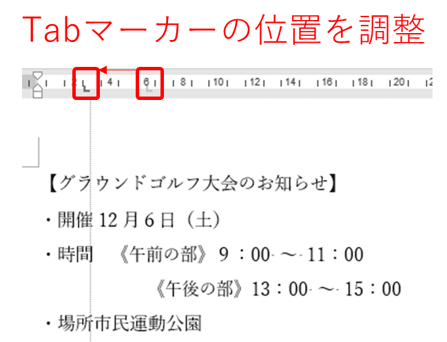 今回の例の場合は《 》で挟まれた『午前の部/午後の部』の項目の補足と、具体的な内容の2か所揃えたい部分があるのでタブマーカーを2つ使いました。