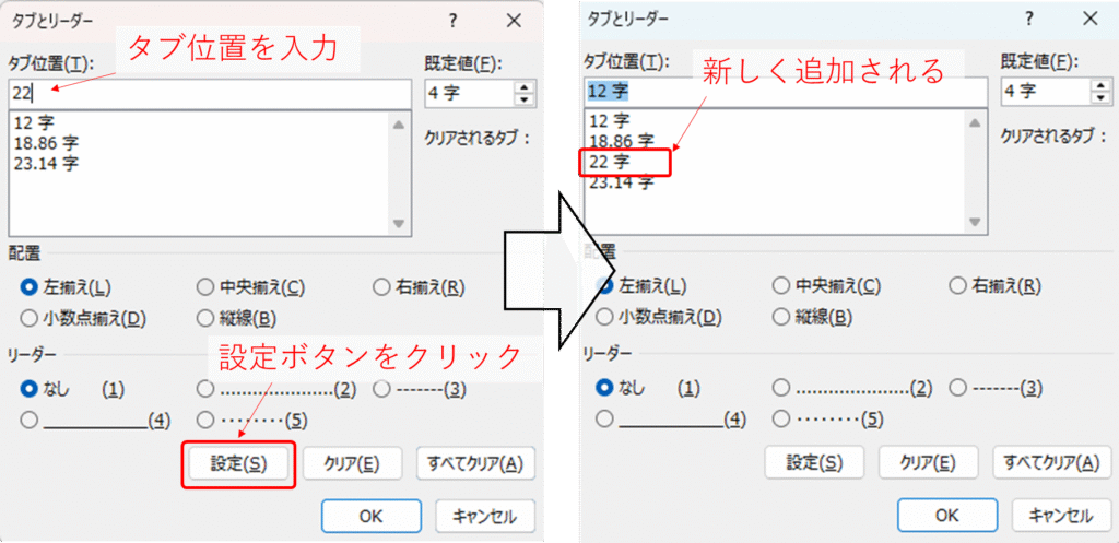 2.『タブとリーダー』のダイアログボックスが表示されたら、『タブ位置』の欄に、目的の数値を入力します。