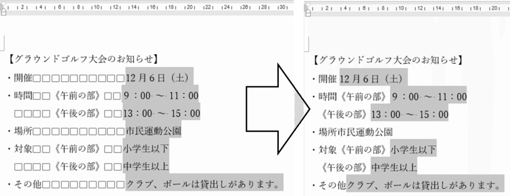2.今回の例では、まず《午前の部》、《午後の部》を同じ位置に揃えます。