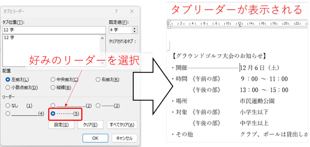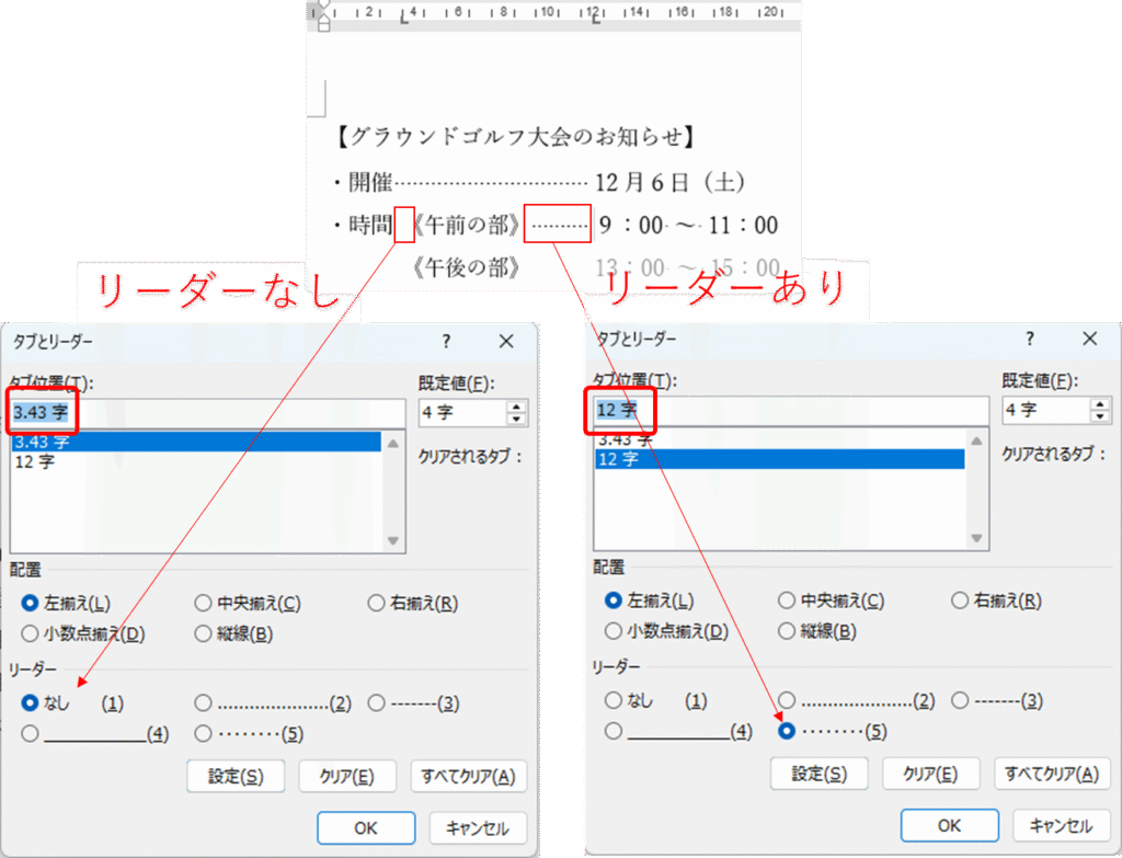 『タブとリーダー』のダイアログボックスの開き方は後述を参照してください。