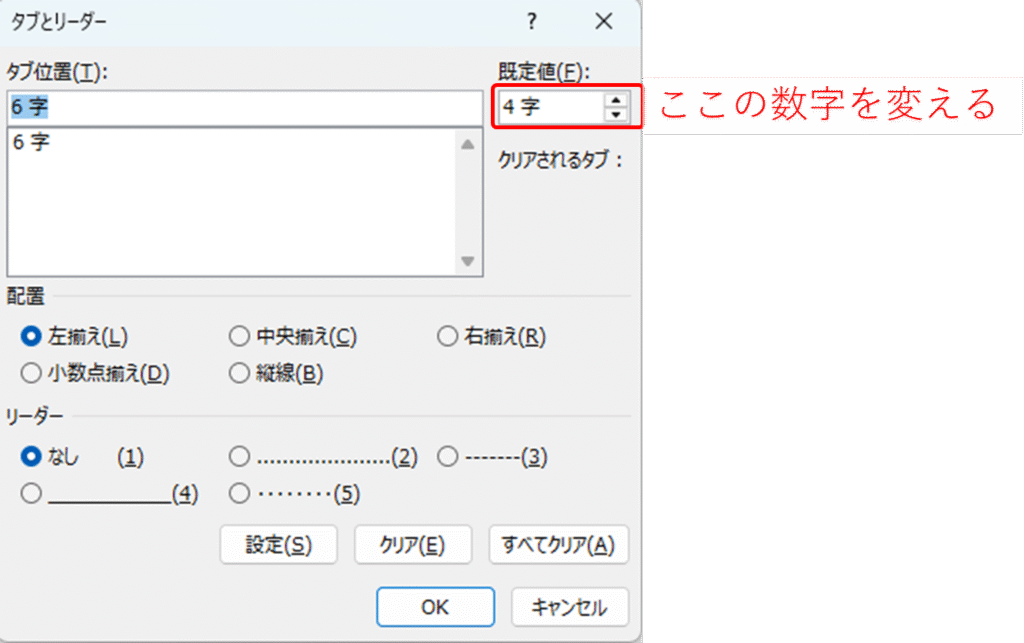 2.『タブとリーダー』のダイアログボックスが表示されたら、削除したいタブ位置の数字を選択します。