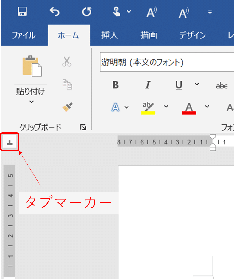 1.タブマーカーをクリックし、『タブとリーダー』のダイアログボックスを表示します。
