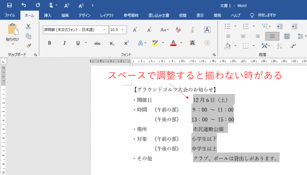 通常はスペースキーで位置を調整してしまいがちですが、スペースではずれやすく、フォントや段落設定を変えると崩れてしまうことがあります。