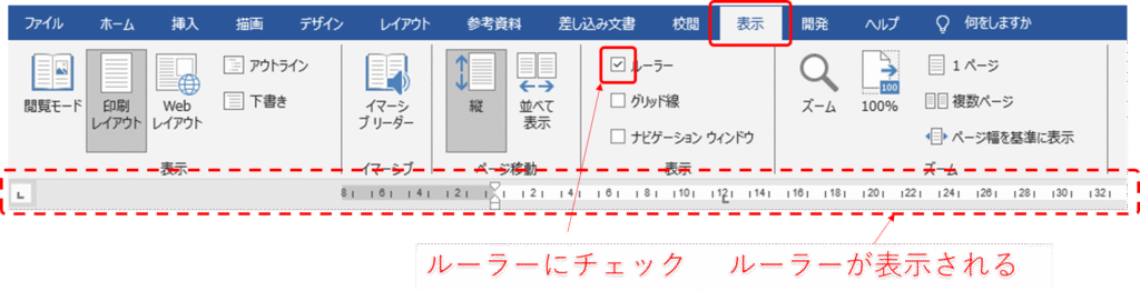 1.『表示』タブの『表示』グループにある『ルーラー』にチェックを入れます。